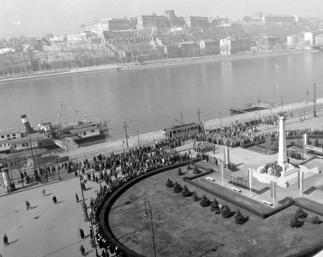 November 7-i ünnepség a Vigadó (1946 és 1957 között: Molotov) téren, a szovjet repülős hősi emlékmű előtt, amit azután 1956-ban romboltak le.
