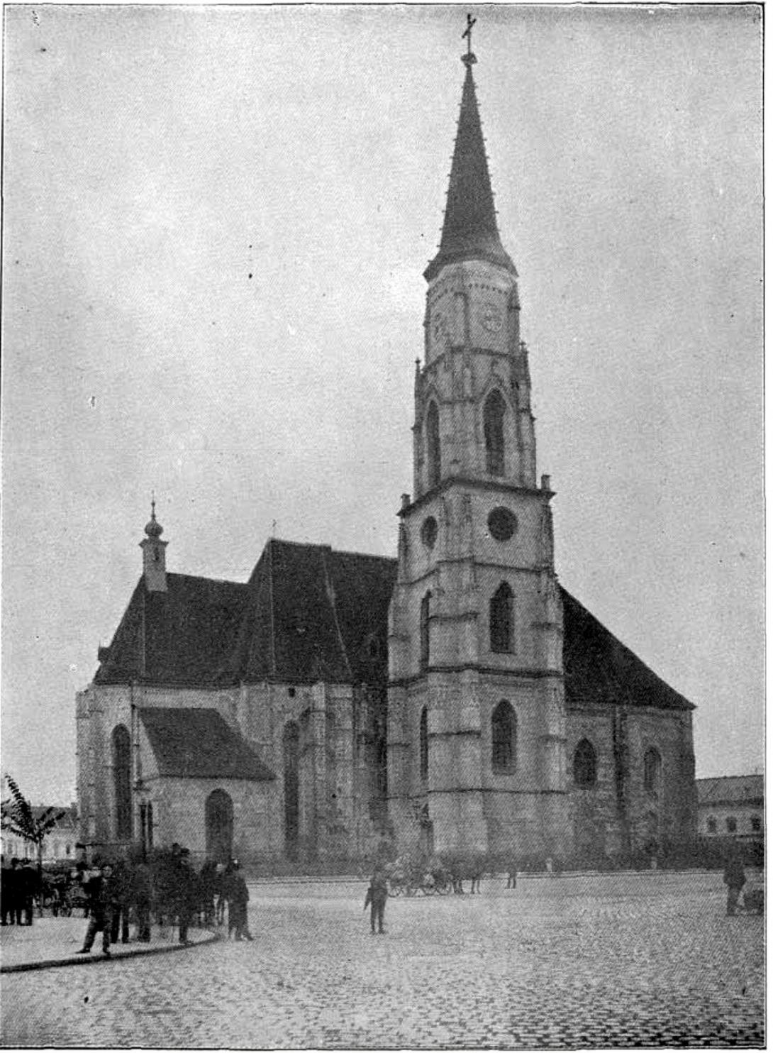 Kolozsvárnak  a XIV. században kiépült hatalmas négyszögű piacterén a feltételezések szerint már a század elején állt egy Szent Mihályról elnevezett templom, aminek a helyén a század közepén egy nagyobbat kezdtek építeni. Az építkezésről az első irat 1349-ből származik, befejezését a nyugati kapun lévő 1444-es évszám jelzi. A templomot 1489-ben tűzvész károsította, majd  még Mátyás király uralkodása alatt restaurálták. A helyreállítás hátráltatta az északi oldalra helyezett  torony befejezését, amit az 1511–1545 közötti időszakra  tesznek.  E  torony az 1697-es tűzvészben elpusztult és csak 1742-1744 között építették újjá barokk stílusban, majd 1763-ban villámcsapás és földrengés károsította, ezért le kellett bontani. A jelenleg is látható neogótikus torony alapkövét 1837-ben tették le és 1859-ben készült el.  (A templom ábrázolása a mai napig szinte kivétel nélkül a déli homlokzat felől történik, ami köszönhető egyrészt az ottani Mátyás-emlékmű nagyon jól illeszkedő látványának, másrészt annak, hogy északról tekintve a torony hatalmas tömbje aránytalannak tűnik.)