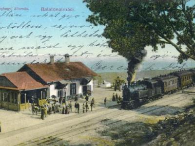 A Győr-Veszprém-Alsóőrs vasútvonal 1906-ban történt tervezése sok érdek által ütköztetett, hosszas viták során alakult. Végül Almádiban a domboldalon vezették a síneket, a mai Töltés, Vécsey, Szabadság-kilátó utcák vonalában. Itt fent volt az igen szép kilátással bíró vasútállomás. Az 1908-ra elkészült vonalat - gazdaságtalanságra hivatkozva - 1968-69-ben szüntették meg.