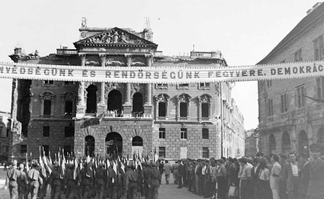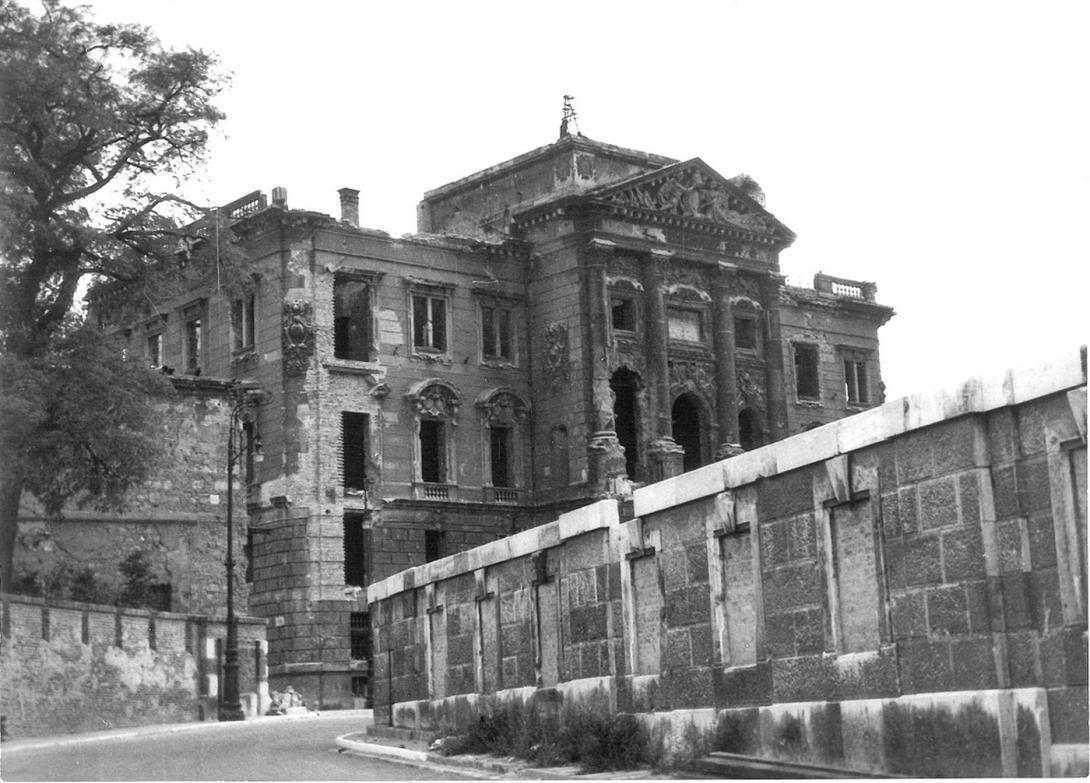A neoreneszánsz stílusú épület a Dísz tér felé négyszintes, kilenctengelyes homlokzattal nézett, háromtengelyes középrizalitját korinthoszi oszlopok és timpanon díszítették, az egész épületet pedig egy téglalap alapú kupola koronázta a Háború és a Béke allegorikus szobraival. A II. világháború idején súlyos károkat szenvedett. A háború után a sérült kupolát és felső emeleteket lebontották. Azóta a helyreállításra, hasznosításra sokféle elképzelés született, pályázatokat írtak ki, késhegyre menő építészeti, műemlékvédelmi, civil vitákkal, de a félig romos épületcsonk több mint 60 éve változatlan állapotban áll. Ez a rom zárja le délről a Dísz tér épületegyüttesét.