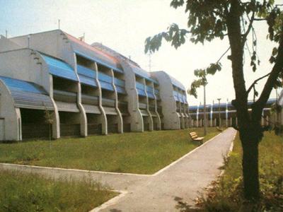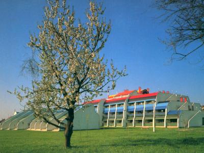 Az épületegyüttes, melyet 4 hektáros bekerített saját park vesz körül, már messziről felhívja magára a figyelmet különös tömegalakításával és színekben gazdag megjelenésével.